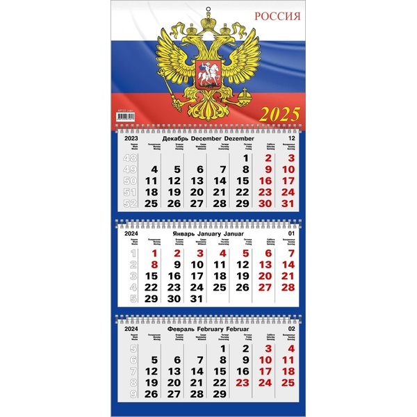 Календарь настенный 3-х блочный 2025 г. Госсимволика, 3 гребеня, бегунок, 310*690 мм