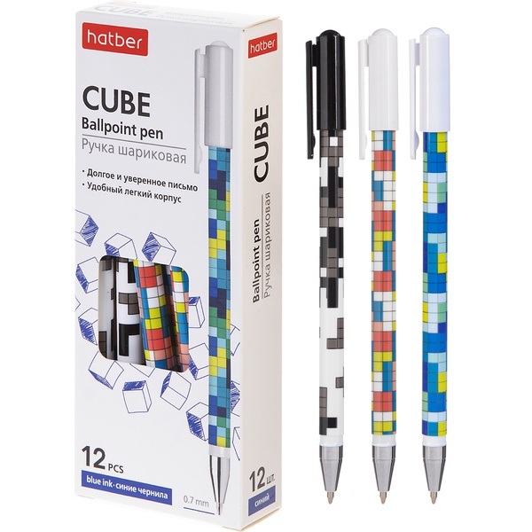 Ручка шариковая синяя, 0.7 мм, круг. корпус, HATBER Cubes_3 дизайна