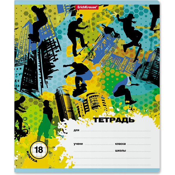 Тетрадь 18 л., клетка, 60 г/м2, обл. мел. картон, ErichKrause Skateboarder_5 дизайнов