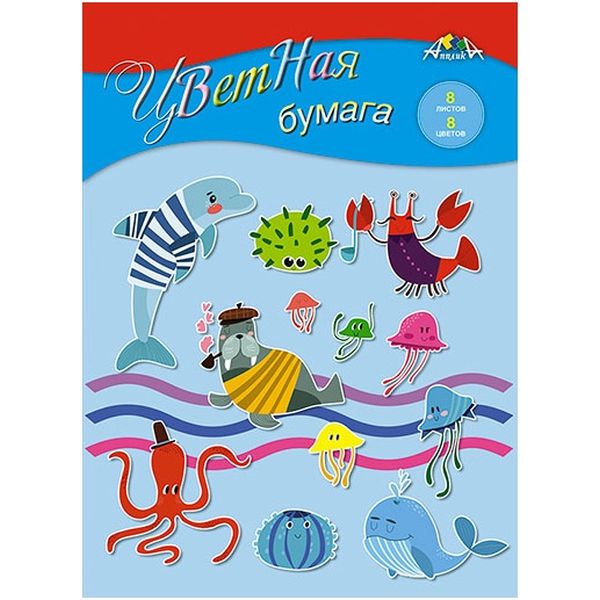 Бумага цветная офсетная 8 цв., 8 л., A4, 50 г/м2, 1-ст., на скобе, АППЛИКА Подводный мир